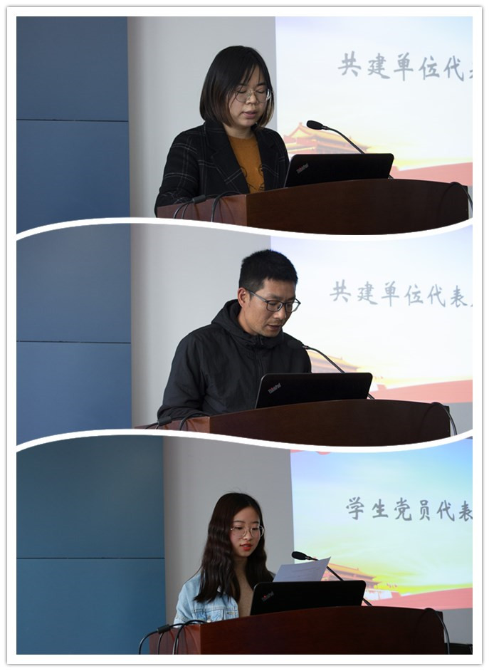 签约仪式后,共建单位代表上台发言。黄杨书记认为,此次签约仪式签下的不仅是一份协议,更是一份情谊、一份责任、一份承诺,并提出无锡市档案史志办机关第一支部将从结对共建内容、结对共建载体和支部品牌特色三个方面对工作进行落实;孙明涛老师则介绍了专项二教研室党支部的基本情况和对于共建结对活动的一些基本设想,指出体育部与人文学院有着千丝万缕的联系,并将共同为江南大学的教育发展提供坚强有力的保障;唐小雨作为学生党员代表进行发言。她认为学生党支部是高校党组织必不可少的组成部分,在结对共建活动中学生党员应不断提高个人党性修养,师生合力搭建好全员育人平台。她代表全体学生党员作出积极参与结对共建活动的承诺。