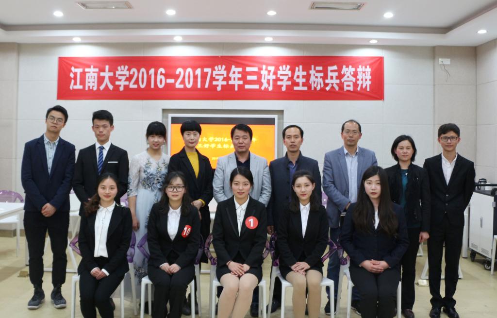 4月4号下午一点半,江南大学2016-2017学年三好学生标兵答辩会议在人文学院田楼517室举行开。江南大学学工处副处长汪双喜、纺织服装学院党委副书记周云龙、商学院党委副书记李荣华、设计学院党委副书记王晖、外国语学院党委副书记刘伯贤、人文学院党委副书记吴宝锁、数字媒体学院院长助理陈祎、法学院分团委书记胡博与本届竞选三好学生标兵选手共同参与了此次答辩会议。本次答辩还邀请了上一届三好学生标兵代表与各位领导老师共同担任答辩评委。