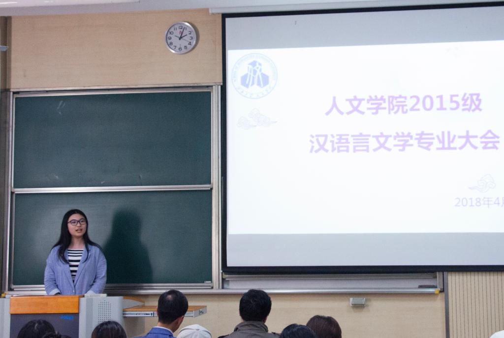 为引导学生科学规划未来,涵养职业发展潜力,4月18日下午两点,人文学院2015级汉语言文学专业大会在一教A105教室顺利召开。人文学院副院长杨晖,党委副书记、副院长吴宝锁,院长助理黄晓丹,年级辅导员崔雪艳,汉语1403班常悦和2015级汉语言文学专业全体学生参加了此次大会。
