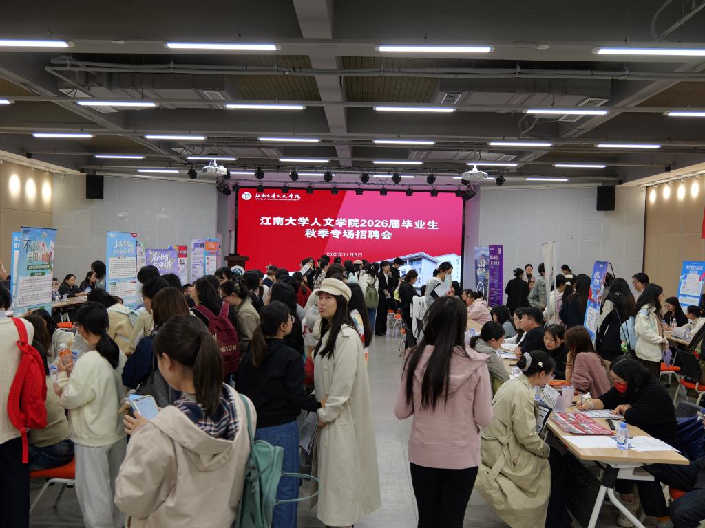 为打通人才供需对接的"最后一公里",促进毕业生高质量充分就业,11月5日,人文学院2026届毕业生秋季专场招聘会在北区活动中心举办。招聘会吸引了来自江苏、上海、浙江等地30余家用人单位参会,参与企业紧密契合学院学科特点,涵盖教育、文化、科技、体育等行业,为毕业生提供了丰富的就业与实习机会。人文学院及兄弟学院500余名学生现场参加。