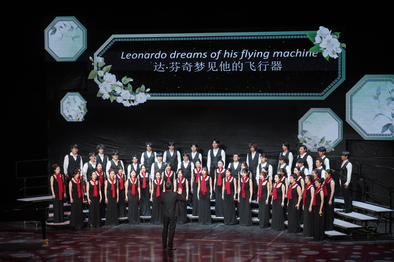 江南大学合唱团由人文学院音乐系学生组成,始终以提升校园审美素养为追求,不仅是学校美育工作的重要平台,更长期致力于推广高雅艺术,在各类省级及以上专业赛事中屡获佳绩。此次演绎的当代美国作曲家埃里克·惠特克的无伴奏合唱作品《达·芬奇梦见他的飞行器》,在指挥李奕辰老师与钢琴林伯涵老师的精心打磨下,既注重艺术表达的创新性,又保持着技巧的精微与平衡,形成了独具特色的演出风格。