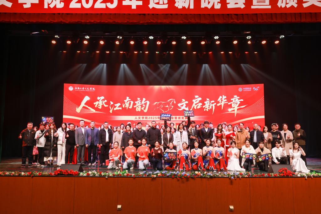12月26日晚,人文学院“人承江南韵,文启新华章”2025年迎新晚会暨颁奖典礼在文浩馆隆重举行。学院党委书记王晖、院长伍红林等领导班子成员,校团委副书记吴垚,各系部教师、合作企业代表、校友及2025级全体新生齐聚一堂,共同见证这场承载传承与启新的盛会。