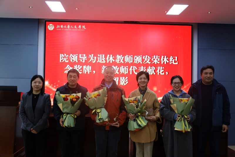 青年教师韩婷芷为参会的沈贵鹏、王小根和杨小红三位荣休教师献花,学院党委书记王晖、院长伍红林颁发荣休纪念奖牌并合影留念。在随后的荣休感言环节,三位老师分享了自己多年来在江南大学的收获、心得和感悟,话语中充满了对学校、学院的眷恋之情和对教育事业的执着与深情,并对学院和年轻教师寄予了希望、表达了祝福。