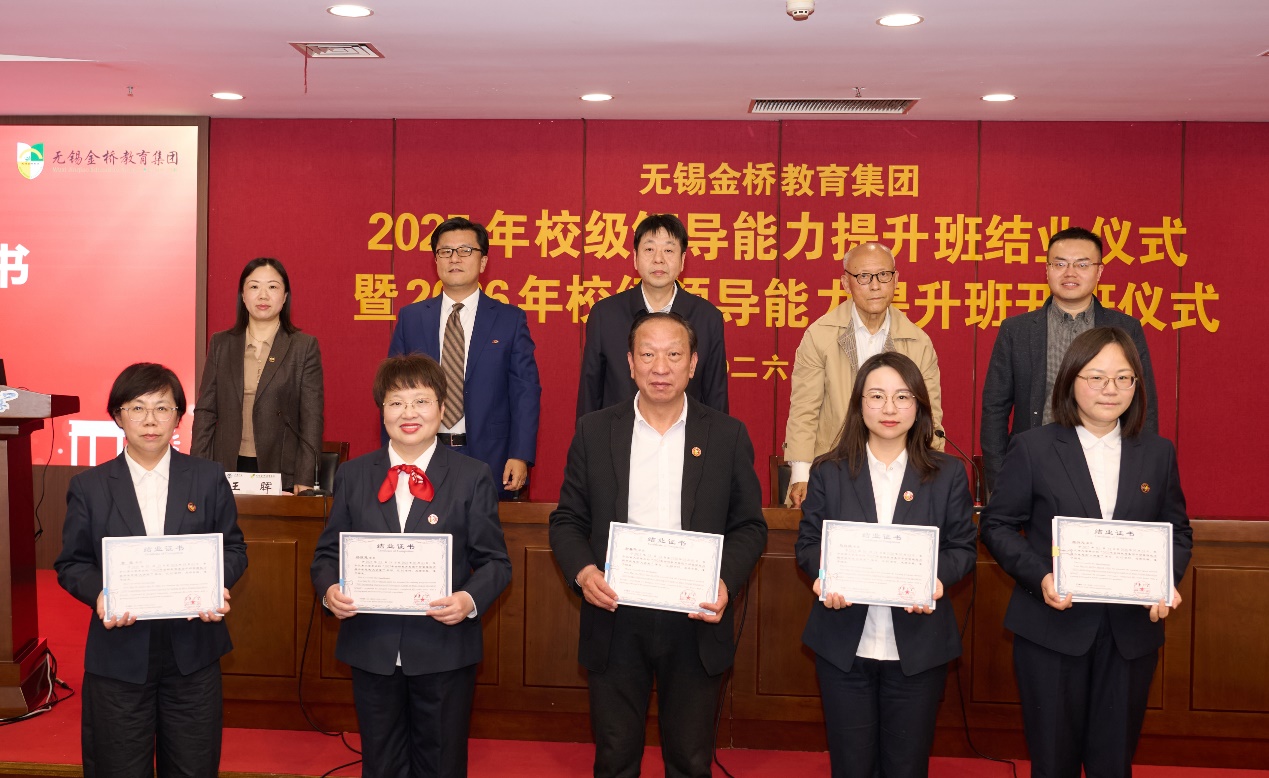 主席台领导为2025年校级领导能力提升班学员颁发结业证书,金桥教育集团人力资源部主任赵芸、金桥双语实验学校校长周兴元、惠山金桥实验学校初中部校长朱丽芳、江阴青阳金桥实验学校副校长周蓉、高新区金桥外国语学校初中部副校长李静五位学员代表上台领取2025年干部领导能力提升班结业证书。