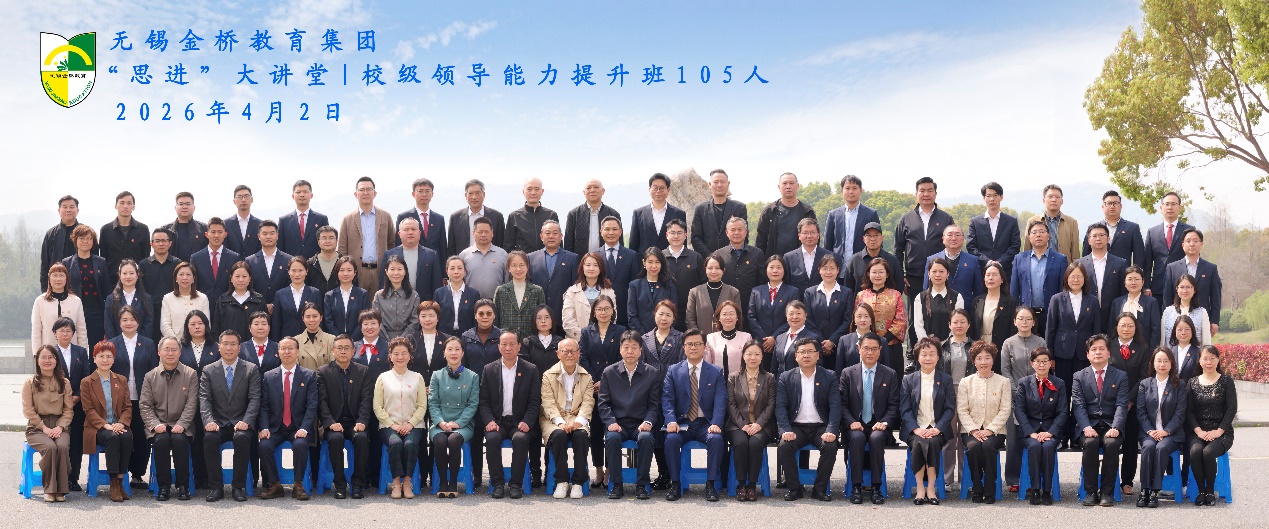 2026年4月2日下午,无锡金桥教育集团2025年校级领导能力提升班结业仪式暨2026年校级领导能力提升班开班仪式在江南大学顺利举行。江南大学党委副书记倪松涛、无锡金桥教育集团董事长马自雄、总经理马翀、人文学院(教育学院)书记王晖、院长助理屈廖健出席仪式。开班仪式由王晖主持,金桥集团105位校级领导参会。