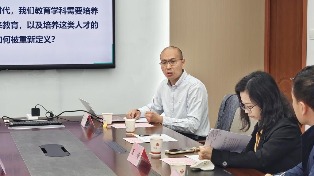 会议伊始,黄锋林介绍了学校本科教育教学改革的整体背景与思路,并对与会的专家表示欢迎。随后,教育技术系副系主任牟智佳围绕人工智能教育专业培养方案进行了系统汇报,重点从“调研论证-培养定位-课程体系-培养路径”四个方面阐述了该方案的设计思路。汇报中提出,要以“教育场景+智能赋能+交叉创新”为人才培养理念,以“坚守教育本色、融合人工智能技术、强化多方协同”为核心实践路径,培养能够立足教育实践用人工智能解决教育真实问题的高素质、创新型、卓越教育人才。